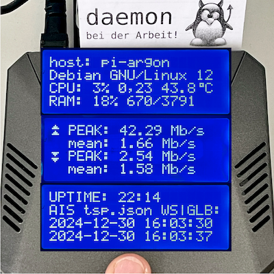 The backends run on a headless Raspberry Pi 4, that consumes less than 5 Watts of power. Server health, as well as ship database timestamps are displayed alternately on a low power 20x4 LCD display for monitoring.