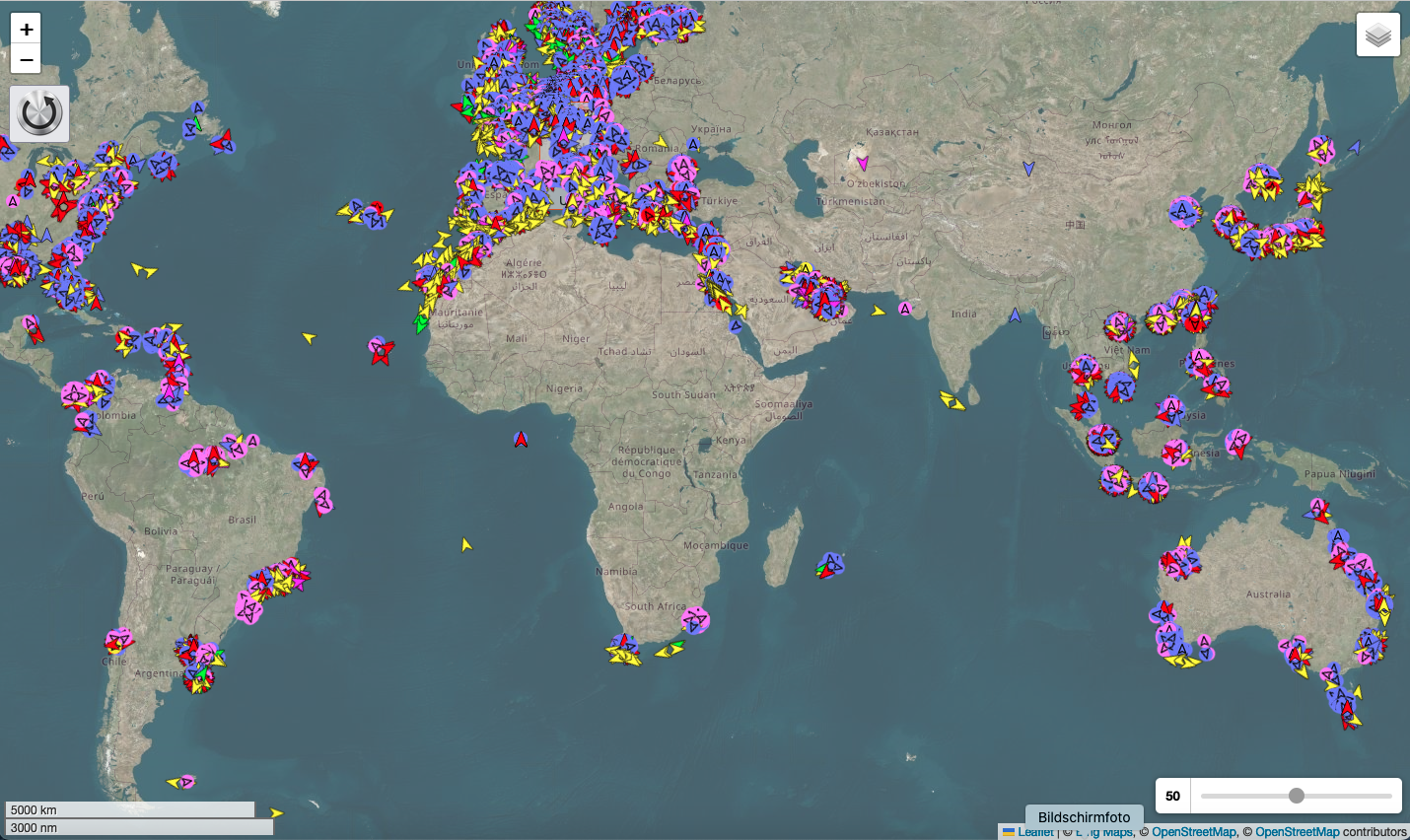IMPLEMENTATION: A separate python backend parses a global AIS datastream from numerous coastal stations, which encompasses about ∼40,000 ships. Coverage varies significantly between geographic regions. The backend parses ∼400 AIS-messages per second and updates the JSON to the webspace once a minute. The Global_AIS frontend is designed for manual refresh via button when zoomed out, with optional autorefresh, when zoomed in. Do not try to zoom to a worldwide view. This will propably overwhelm your browser, although it is possible (screenshot). The map initially centers on the port of Hamburg, Germany.